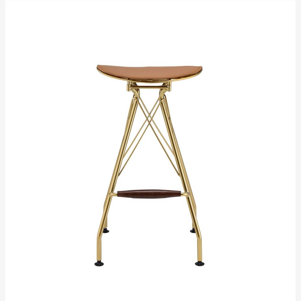 It features a gold metal frame with a whiskey faux leather seat cushion. A streamlined silhouette adds a flair of chicness.