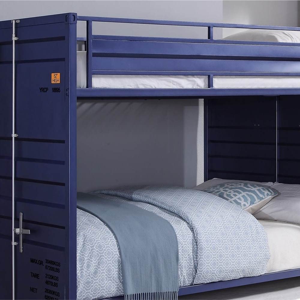 This contemporary container-themed metal bunk bed is crafted with an industrial look that is an ideal addition to your bedroom.