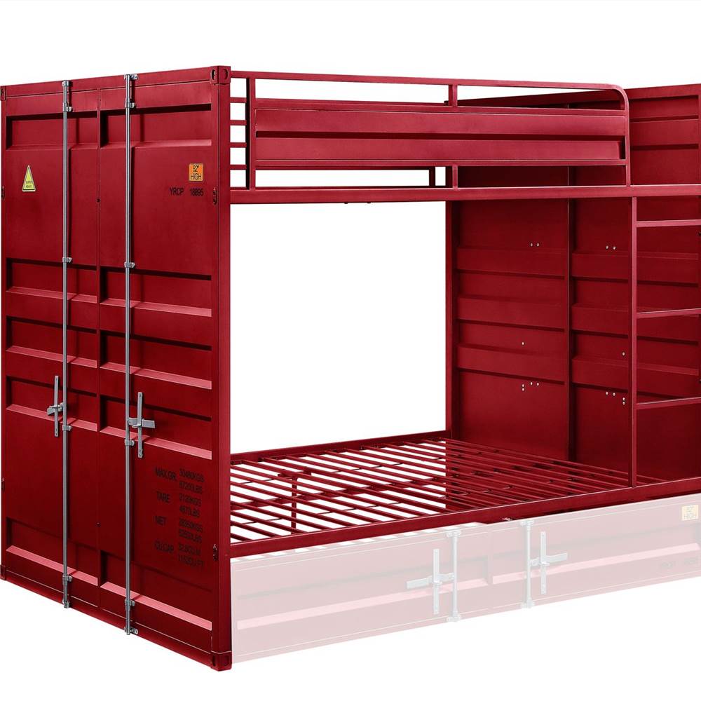 This contemporary container-themed metal bunk bed is crafted with an industrial look that is an ideal addition to your bedroom.
