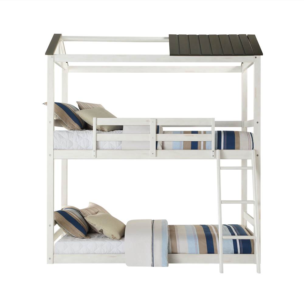 This unique wood twin over twin bunk bed features easy-access guardrails, a reversible front ladder and a decorative cottage-themed roof over the top bunk.