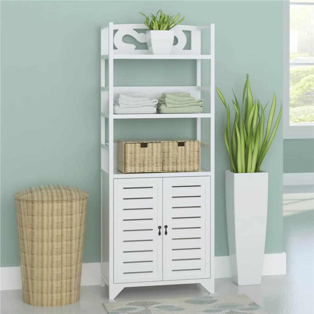 This elegant wooden bathroom cabinet is sure to be an eye-catcher in your bathroom. This floor standing cabinet has a white finish and will be an excellent storage solution for all your bathroom accessories, such as towels, laundry and cosmetics. This high-quality cupboard features a cabinet compartment including 2 doors and 3 upper shelves. This chest is versatile enough to be used in corridors, offices or guest rooms as well. It is handy to clean and maintain. Assembly is very easy.