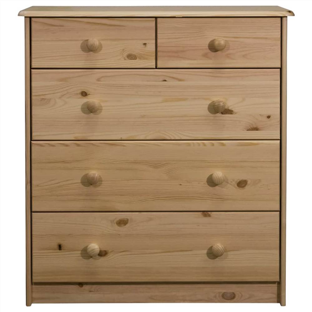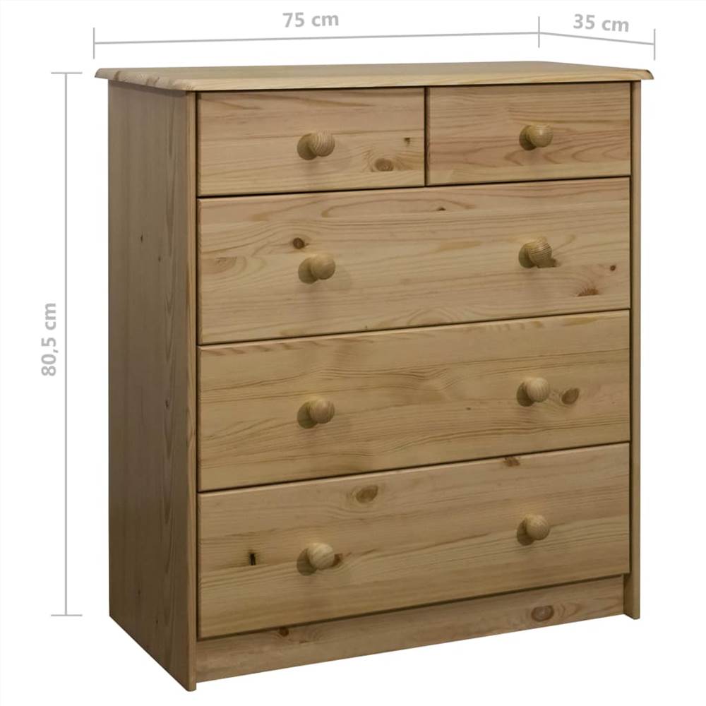 This wooden chest of drawers exudes a vintage charm and will be the centre of attraction for your interior. The drawer cabinet is made of solid pine wood, making it stable and durable. The round wooden knob is designed for opening the drawer easily. Besides, this sideboard features 5 drawers in different sizes, providing commodious space for storing your clothing, books, as well as various other items. Important note: Colours and grains vary from piece to piece, making each piece unique; the delivery is random.