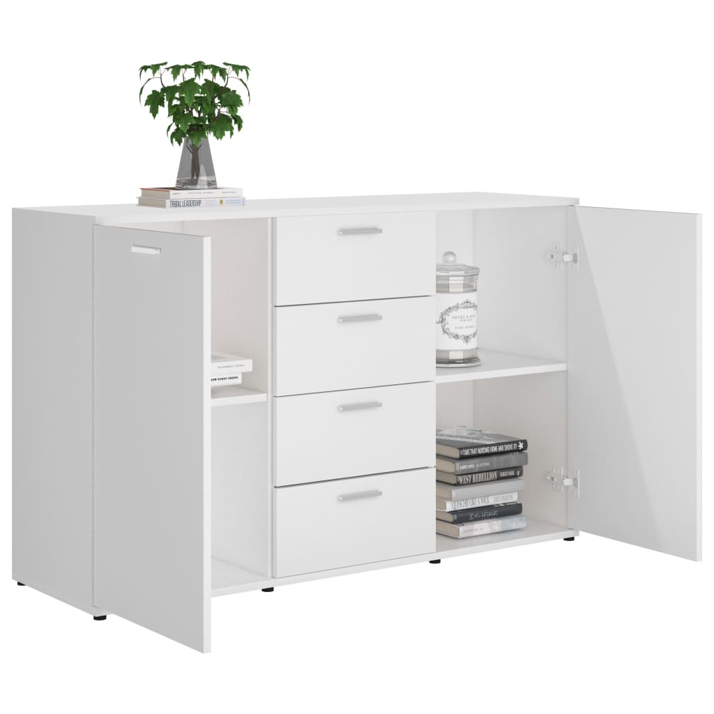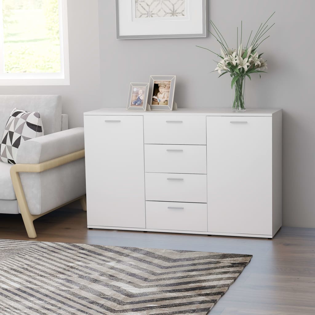 This sideboard, featuring a minimalist design, will make a practical as well as highly decorative addition to your home. With 2 doors and 4 drawers, the sideboard provides ample storage space for books, multimedia appliances and other items. The sturdy tabletop is ideal for displaying decorative objects, photo frames, or potted plants. Thanks to the premium board material, this sideboard is stable and built to last. Additionally, the drawer cabinet is easy to clean with a damp cloth. This item is easy to assemble.