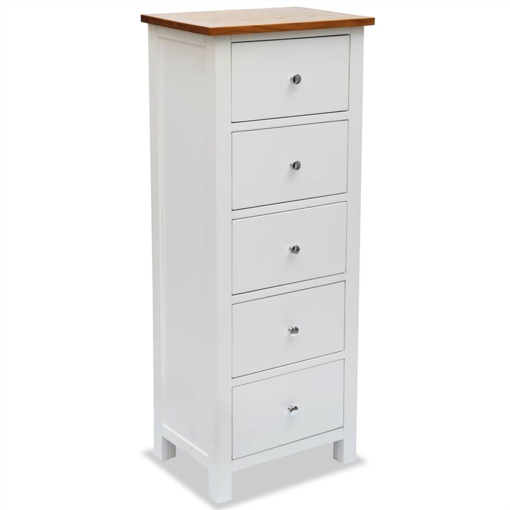 Our two-tone tall chest of drawers will give your home decor a touch of elegance with its timeless design. The wooden cabinet has 5 drawers and provides an ideal storage solution for clothing and smaller items. The chest of drawers has a solid oak top, which adds to its sturdiness and durability. The oak has beautiful wood grains that give the furniture a touch of natural charm. The body is made of solid pinewood with a white finish and boasts a contemporary style. Thanks to its compact design, this chest of drawers doesn’t take up much space but is very practical. Note: The item is already assembled; no assembly is required.