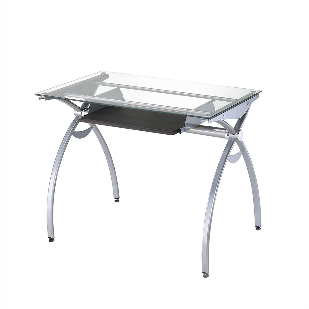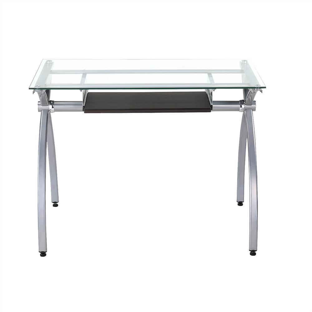 It is made with a heavy-duty 8 mm tempered safety glass desktop with, scratch-resistant powder-coated steel frame. Its slide-out keyboard shelf is equipped and is made of MDF wood laminate.
