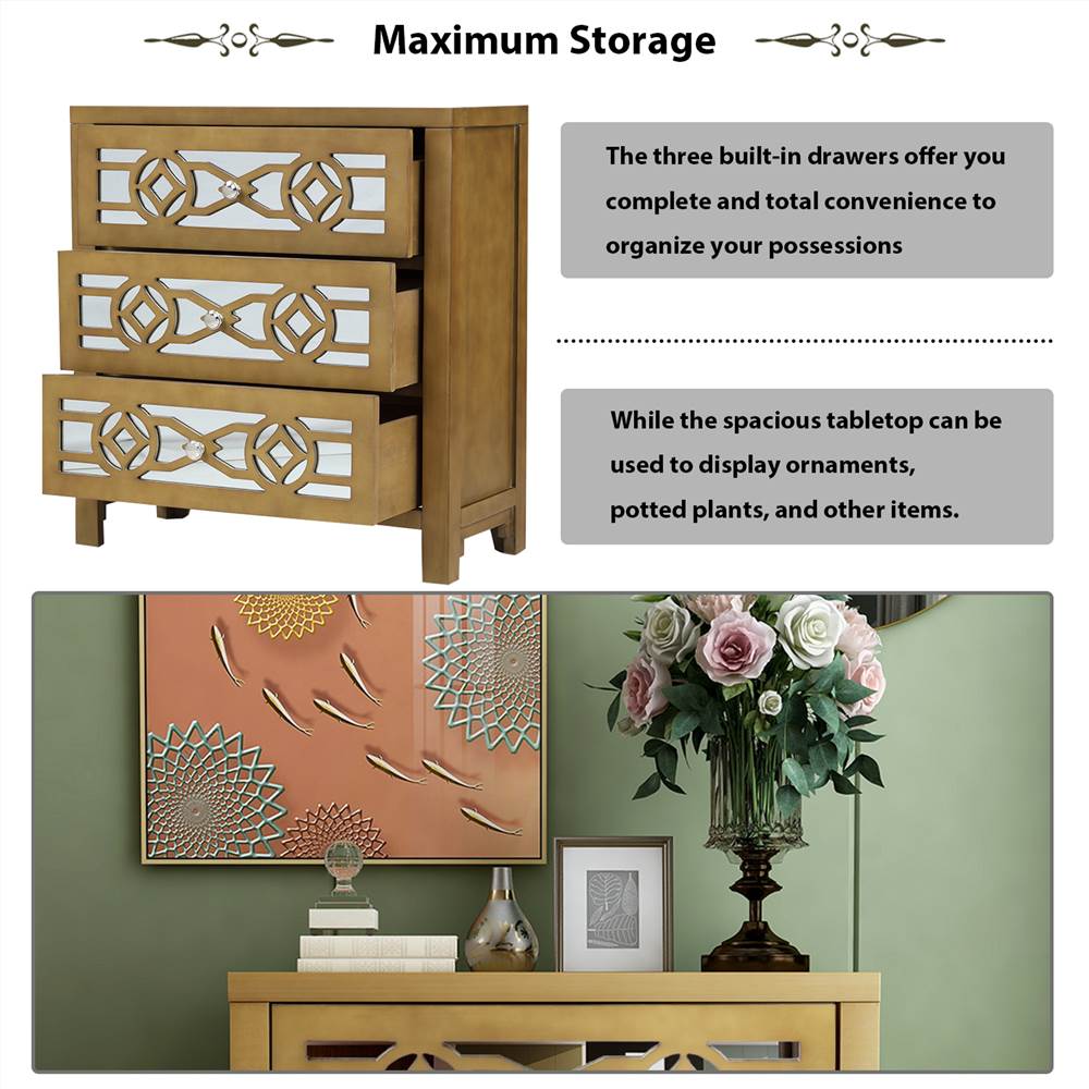 TREXM 26″ Wooden Storage Cabinet With 3 Drawers And Decorative Mirror, For Entrance, Hallway, Dining Room, Kitchen – Gold