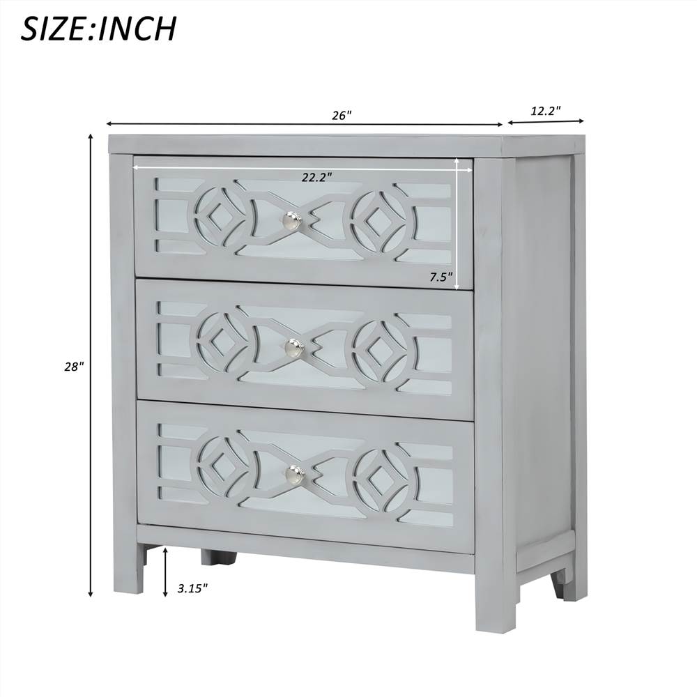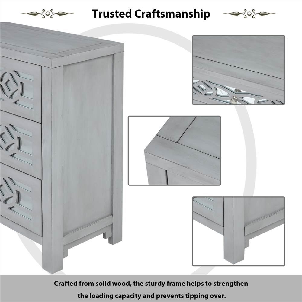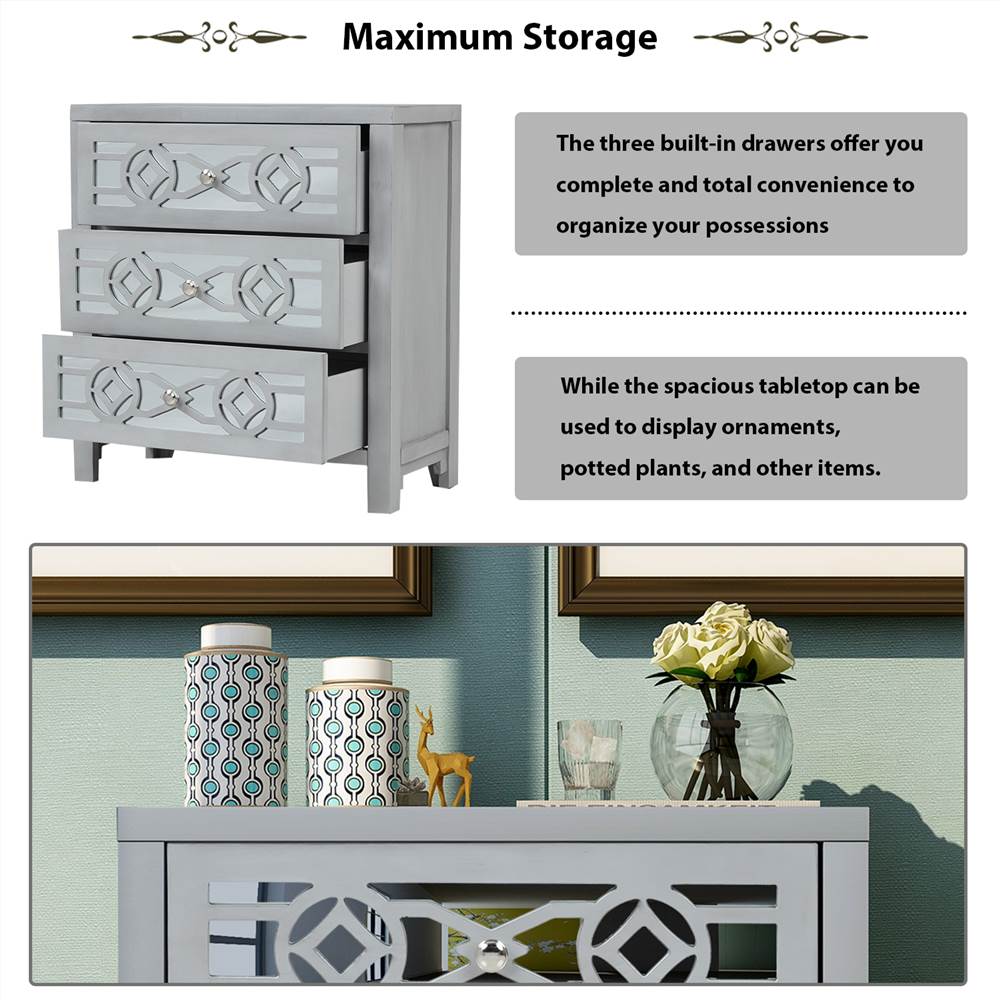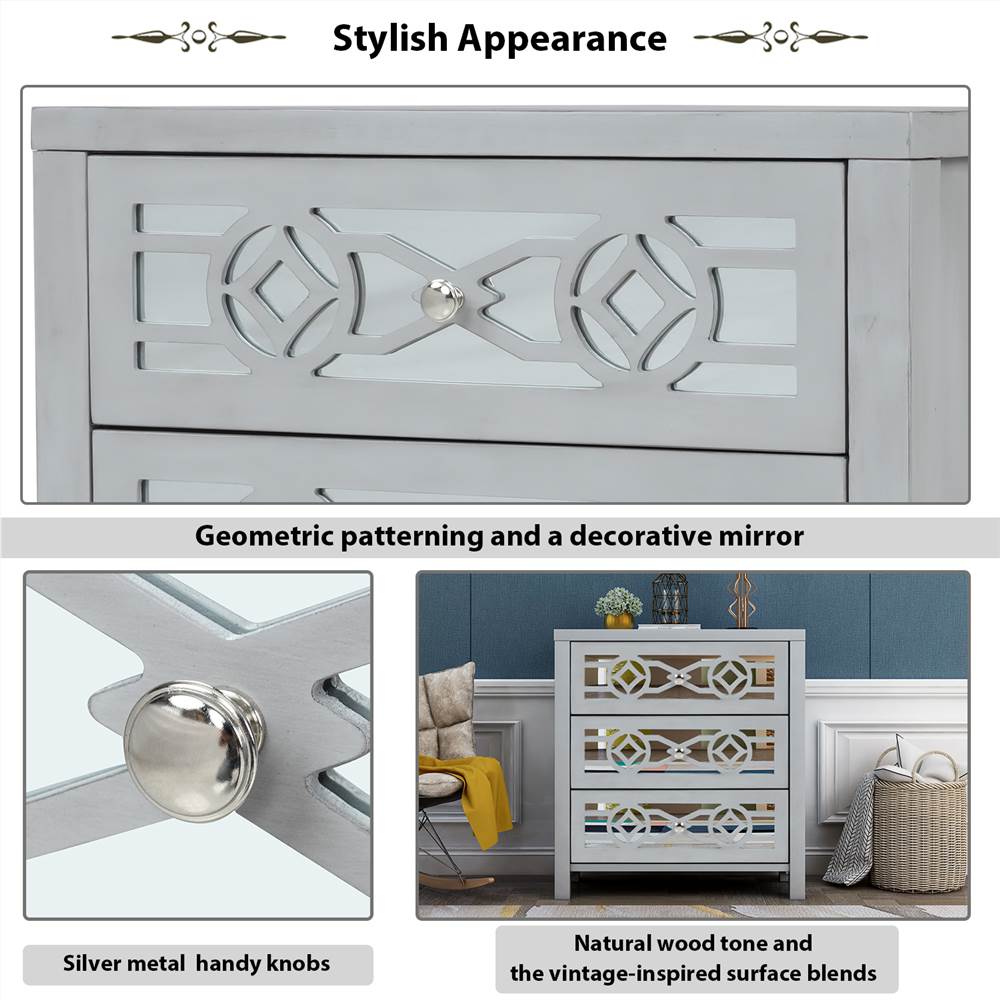 Featuring an eye-catching front-facing silhouette with geometric patterning and a decorative mirror, this cabinet affords a chic modern appearance for your home. The silver metal handy knobs, light natural wood tone, and the vintage-inspired surface blends together to bring a unique charm. This cabinet works well as a console table, entrance hall table, or a sofa-side table, creating your style effortlessly.