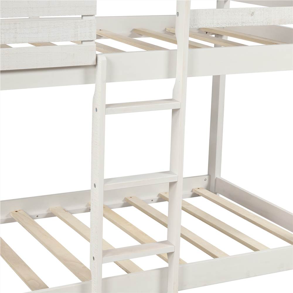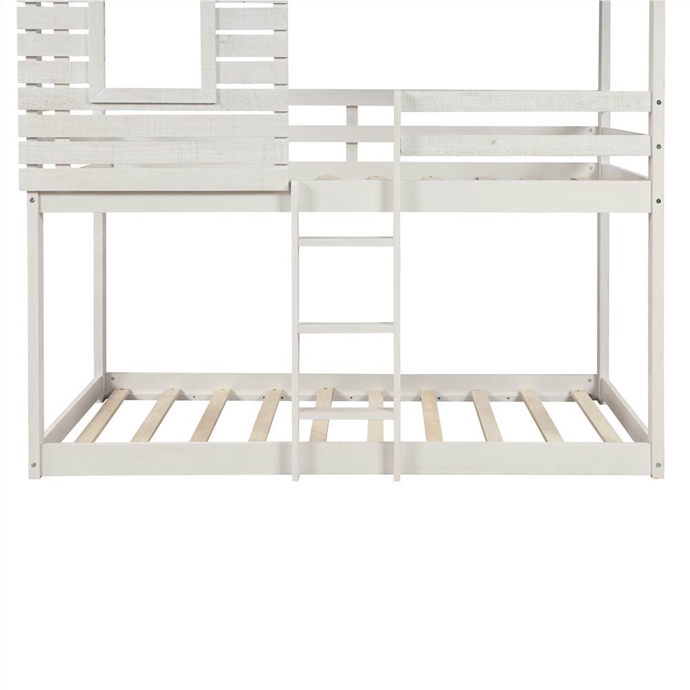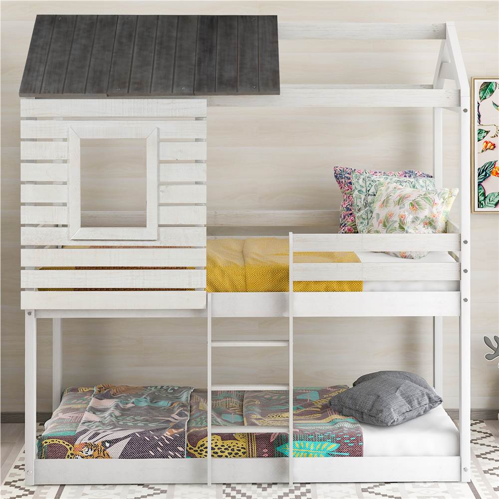 Featuring a pitched roof and wall section with a window, this unique and intricately designed bunk bed creates a fun and adorable space that not only serves as a comfortable sleeping area but also doubles as space for your kids to play and have fun.
